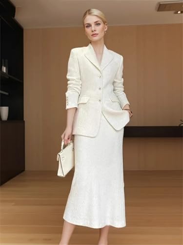 Conjunto de 2 piezas de chaqueta de tweed clásica beige + falda para mujer, beige, XL