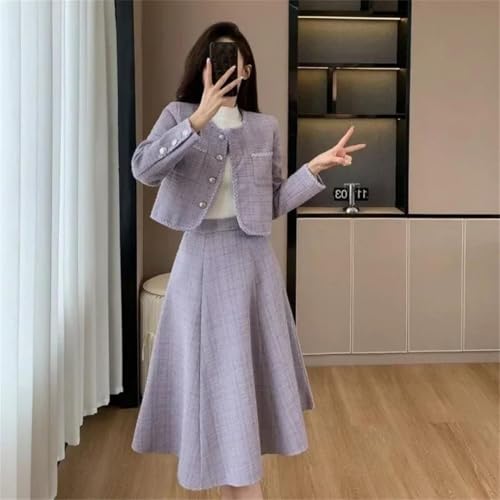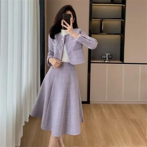 Conjunto de dos piezas de tweed para mujer, chaqueta corta + falda acampanada de longitud media coreana, Negro, L